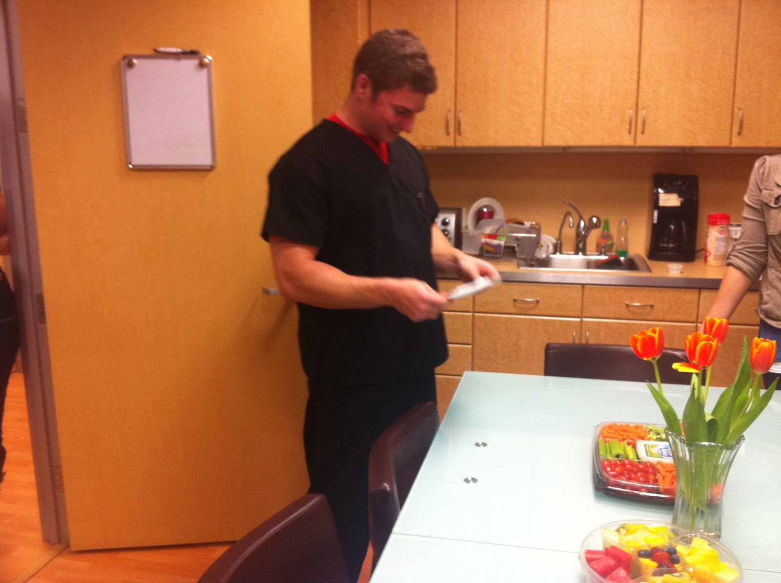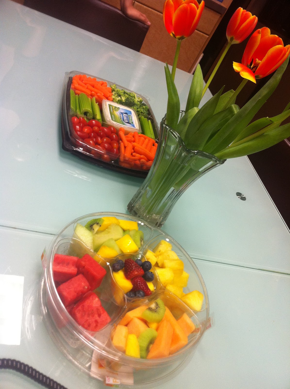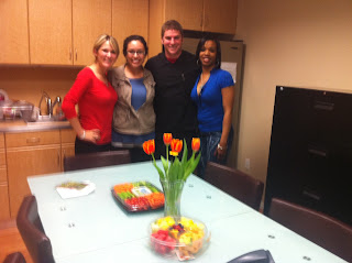 Yesterday we celebrated both Valentines Day and Ross' Birthday! Each time it is someone's birthday in the office we have the pleasure of ordering an amazingly delicious and not so nutritious cake. However, Ross does not eat sweets so to show him how much we appreciate him we celebrated over fruit and veggies! Here is a look at Ross' special day- we had to thank him for leading by example to a healthier lifestyle!